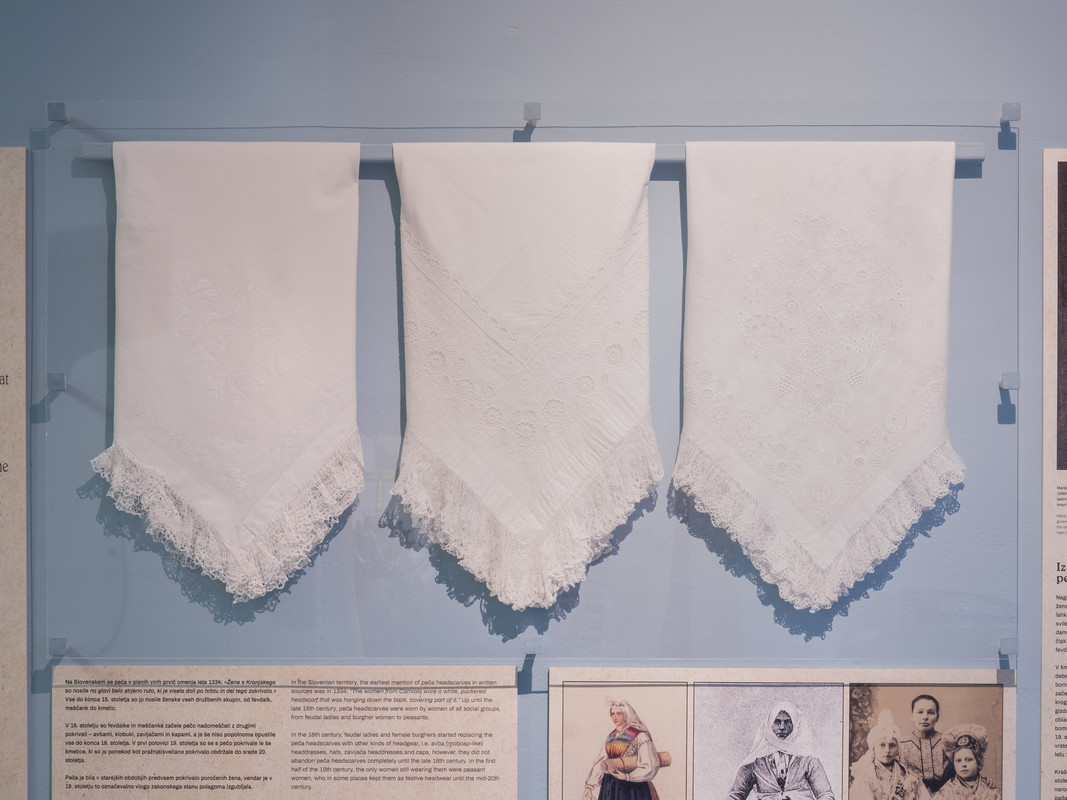 Naglavne rute, peče, so bile izdelane iz lanenega platna. V 16. stoletju so imele ženske iz višjih družbenih plasti (fevdalke in meščanke) poleg platnenih, ki so bile lahko krašene s črno svileno vezenino ali vtkanim zlatom, tudi peče, narejene iz svile, žameta in bombaža. V 17. stoletju so se omenjenim materialom pridružili še damast, čipke in pletenine. Klekljane peče iz nemških, nizozemskih in “kranjskih” čipk ter peče iz pajčolana pa so si lahko konec 17. in v 18. stoletju privoščile le fevdalke.