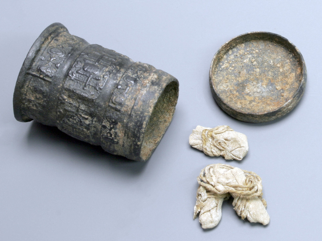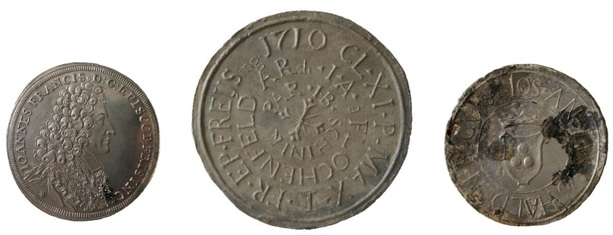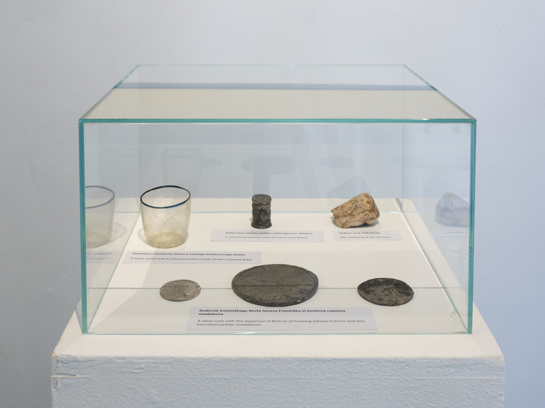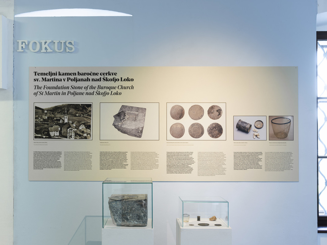 V letih 2008–2009 in 2021–22 so v Poljanah nad Škofjo Loko potekala zaščitna arheološka izkopavanja. Ob tem so bili odkriti arhitekturni ostanki poljanskih cerkva od romanske prek gotske do baročne faze. Najzanimivejša arheološka najdba iz zadnje baročne faze poljanske cerkve, ki jo hranimo v Loškem muzeju, je temeljni kamen z vklesano letnico 1710, odkrit v severnem temelju prezbiterija. V kvadratni niši v sredini kamna, velikosti 11 × 11 × 5,5 cm in pokriti z natančno obdelanim skrilastim pokrovom, se je nahajalo več predmetov. Med njimi so bili srebrn novec, dva kositrna medaljona, relikviarij v voščenem omotu in steklen predmet, ki je bil ob odkritju popolnoma zdrobljen in brezobličen. Šele po restavriranju v konservatorski delavnici Narodnega muzeja Slovenije v Ljubljani se je izkazalo, da gre za posodico višine 5,7 cm, s premerom ustja 6 cm in premerom dna 4,9 cm. Izdelana je iz tankega brezbarvnega pihanega stekla z vbočenim dnom in ustjem, obrobljenim z modrim robom. Poleg posodice je bil v niši temeljnega kamna tudi odlično ohranjen srebrnik škofa Janeza Frančiška s premerom 4,2 cm in maso 30 g. Na prvi strani ob njegovi podobi srečamo okrajšan latinski napis: IOANNES FRANCIS[CUS] D[EO] G[RATIA] EPISCOP[US] FRISING[ENSIS]. V slovenskem prevodu bi se glasil takole: Janez Frančišek, po Božji milosti freisinški škof. Na drugi strani poteka prav tako okrajšan napis: SAC[RI] ROM[ANI] IMP[ERII] PRINCEPS, kar v prevodu pomeni: knez Svetega rimskega cesarstva. Ob srebrniku sta bila odkrita še dva napisna medaljona iz kositra. Večji s premerom 9,1 cm in maso 192 g je prav tako odlično ohranjen. Na sprednji strani poteka okrog in okrog latinski napis: 1710; CL[EMENS] XI. P[ONTIFEX] MAX[IMUS]; I[OANNES] FR[ANCISCUS] EP[ISCOPUS] FREYSING[ENSIS]; ARch[IDIACON] I[OANNES] A[NDREUS] FLOCHENFELD; PAR[ROCHUS] I[OANNES] B[APTISTA] SCHINIK. Poleg letnice 1710, ki pomeni začetek gradnje cerkve s polaganjem temeljnega kamna, se omenjajo papež Klemen XI., freisinški škof Janez Frančišek, arhidiakon Janez Andrej Flokenfeld in župnik Janez Krstnik Šink iz Poljan nad Škofjo Loko v letih 1705–1715. Drugi manjši medaljon s premerom 5,8 cm in maso 37 g je precej slabše ohranjen. Na sprednji strani vidimo v sredini grb barona Haldna, na zadnji strani, ki jo je zob časa že močno načel, pa lahko razberemo zgolj letnico MDCCX in napis [FOEDERATI GERMANICI CUM] GAL[IA] [ET] HISP[ANIA] BEL[LI] X[DECIMO] A[NNO], kar bi pomenilo: 1710, v desetem letu vojne [nemških zaveznikov] s Francijo in Španijo. Skratka, tu še enkrat najdemo potrditev datacije temeljnega kamna poljanske cerkve, ki so ga položili leta 1710, v desetem letu španske nasledstvene vojne, ki je v tem času divjala v Evropi. Poleg medaljonov je bil v temeljnem kamnu v voščenem ovoju z vidnimi ostanki rdečega pečatnega voska skrbno shranjen lepo okrašen kositrn relikviarij valjaste oblike, visok 3,5 cm, s premerom 2,5 cm in maso 47 g. Vseboval je tri svitke, zavite v svileno tkanino in pazljivo povezane s tanko vrvico. Nedvomno imamo opravka z relikvijami svetnika – tremi prstnimi členki cerkvenega zavetnika sv. Martina.